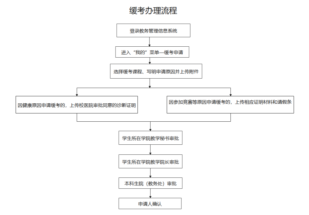 二、申请缓考的学生原则上须于考试前3-7天在教务管理信息系统提交缓考申请,申请中须写明原因、考试时间并上传必要的证明材料作为附件,经学院审核、本科生院(教务处)批准后,可缓考;考前未递交缓考申请或缓考申请未被批准的学生擅自不参加考试,按缺考处理。