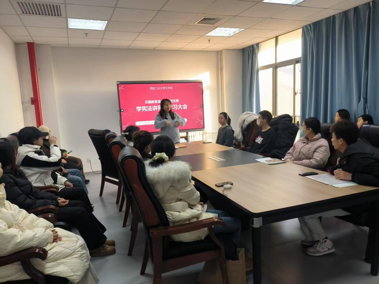 为深入学习贯彻习近平法治思想,增强支部党员宪法意识和法治素养,营造尊崇宪法、学习宪法、遵守宪法、维护宪法、运用宪法的良好氛围,12 月 26 日下午,汉国教英语本科生党支部在教 9-303召开了“学宪法 讲宪法”专题学习会,党支部书记王丹丹主持,党支部副书记李文妍主讲。