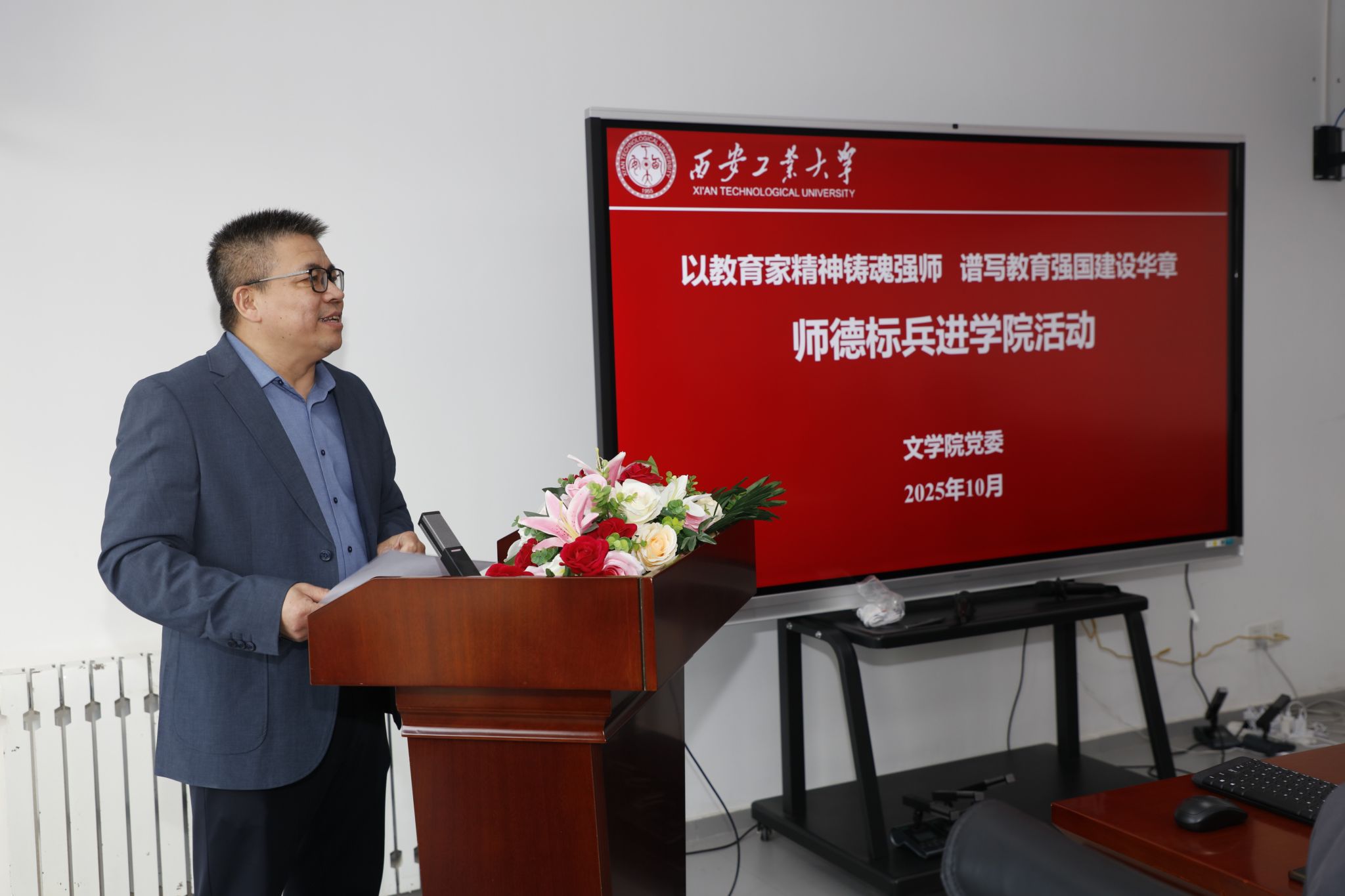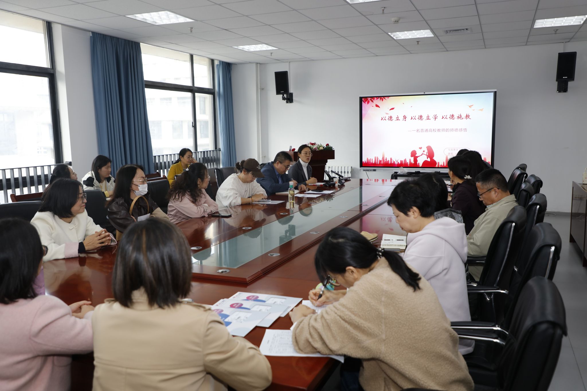 为深入学习贯彻习近平新时代中国特色社会主义思想,全面贯彻落实全国、全省教育大会精神,加大师德典型宣传力度,充分发挥师德典型示范引领作用,在校党委教师工作部的安排下,文学院于10月31日下午开展了“师德标兵进学院”培训活动,特邀请校级师德标兵、马克思主义学院梁花副教授为全院教师做了题为《以德立身 以德立学 以德施教——一名普通高校教师的师德感悟》的专题报告。报告会由院长程建虎主持,文学院全院教师参加了此次活动。