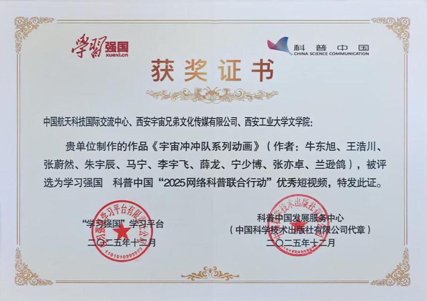 近日,文学院参与制作的《宇宙冲冲队系列动画》入选“2025网络科普联合行动”优秀短视频。该作品由中国航天科技国际交流中心、西安宇宙兄弟文化传媒有限公司与西安工业大学文学院完成。